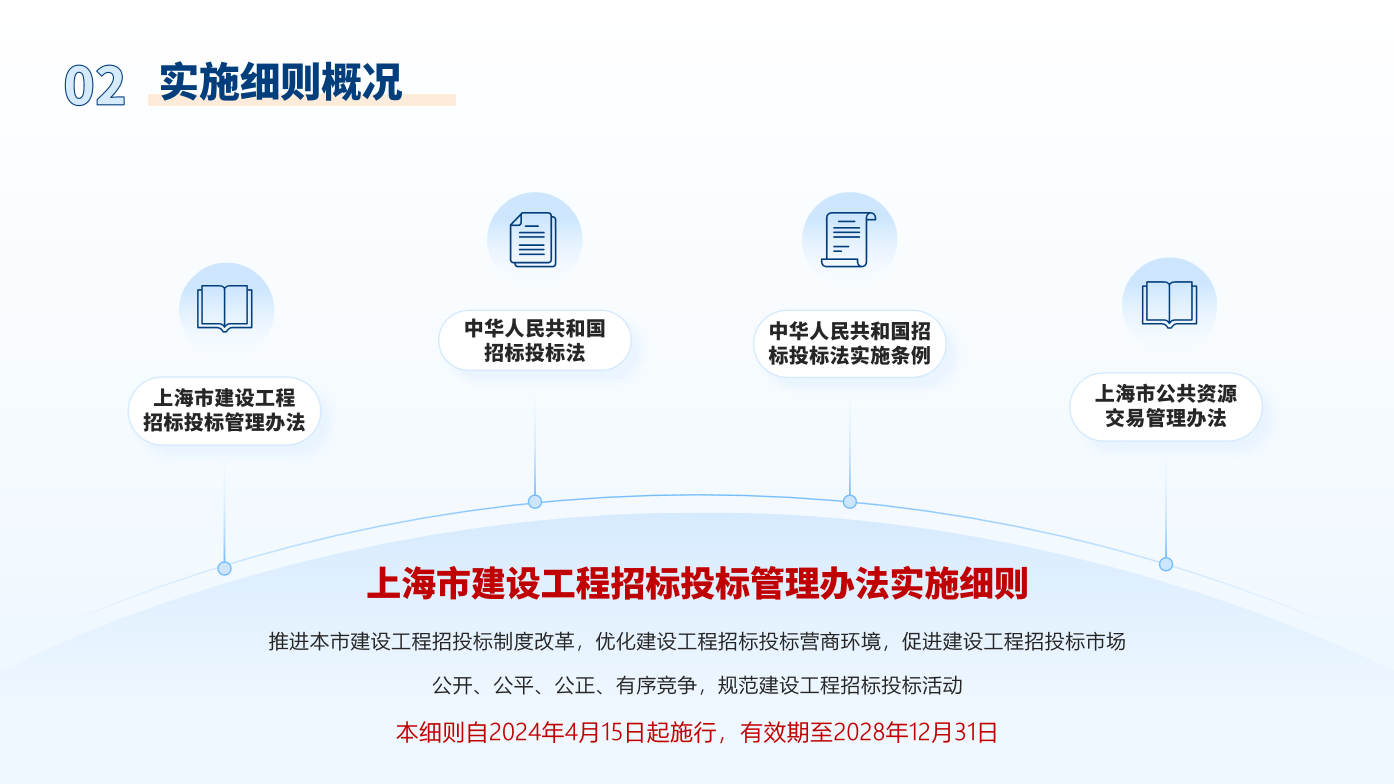 单为持续推进本市建设工程招标投标制度改革,优化建设工程招标投标领域营商环境,促进建设工程招投标市场公开、公平、公正、有序竞争,规范建设工程招标投标活动,依据《中华人民共和国招标投标法》《中华人民共和国招标投标法实施条例》《上海市建设工程招标投标管理办法》《上海市公共资源交易管理办法》等相关法律、法规和规章规定,市住房城乡建设管理委制定了本实施细则。具体详见↓